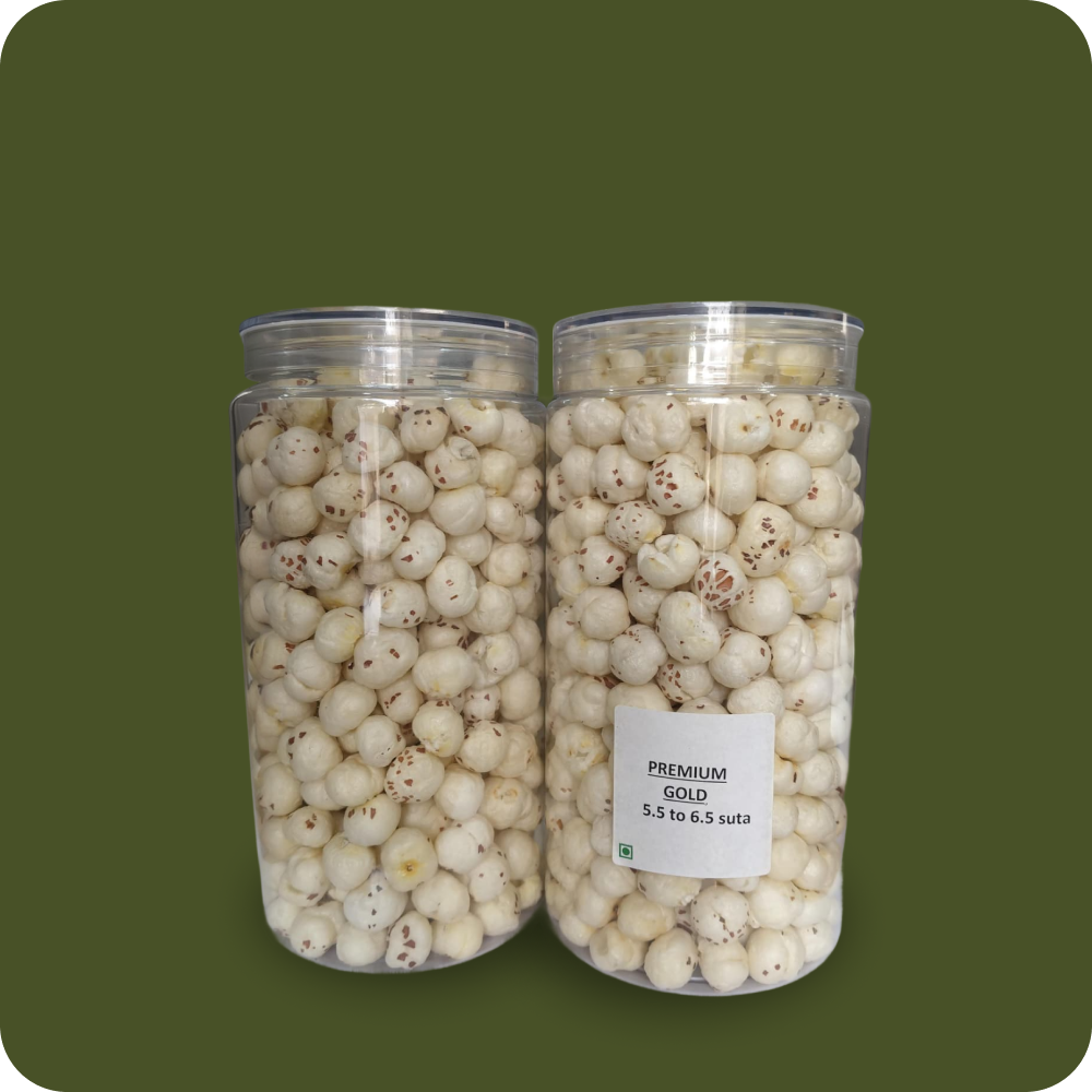 Standard Gold Makhana is available in a size range of 4.5–6.5 suta. It is suitable for roasting and flavored product applications.